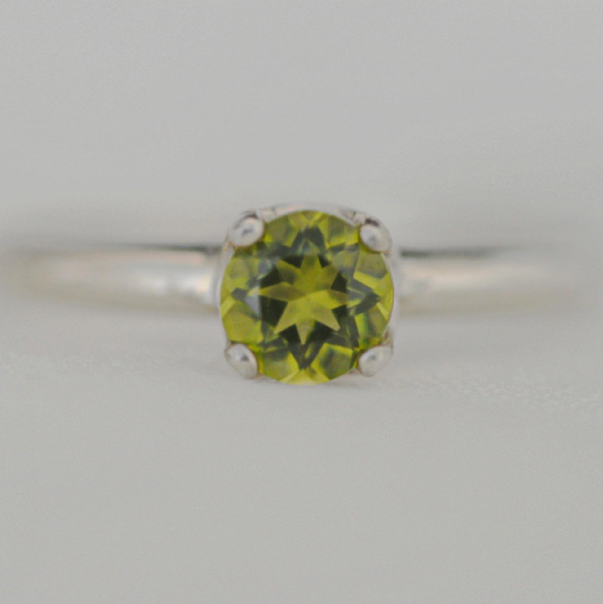 Alaqua - Gorgeous fine green natural earth mined 5mm round Peridot gemstone ring, finger size 7, set in easy care Argentium® Silver - no plating. Peridot is used as a birthday gem for the month of August. Sizing, if needed, is FREE. Shipping, insurance, tracking, and my standard random gift wrapping are FREE within the United States.