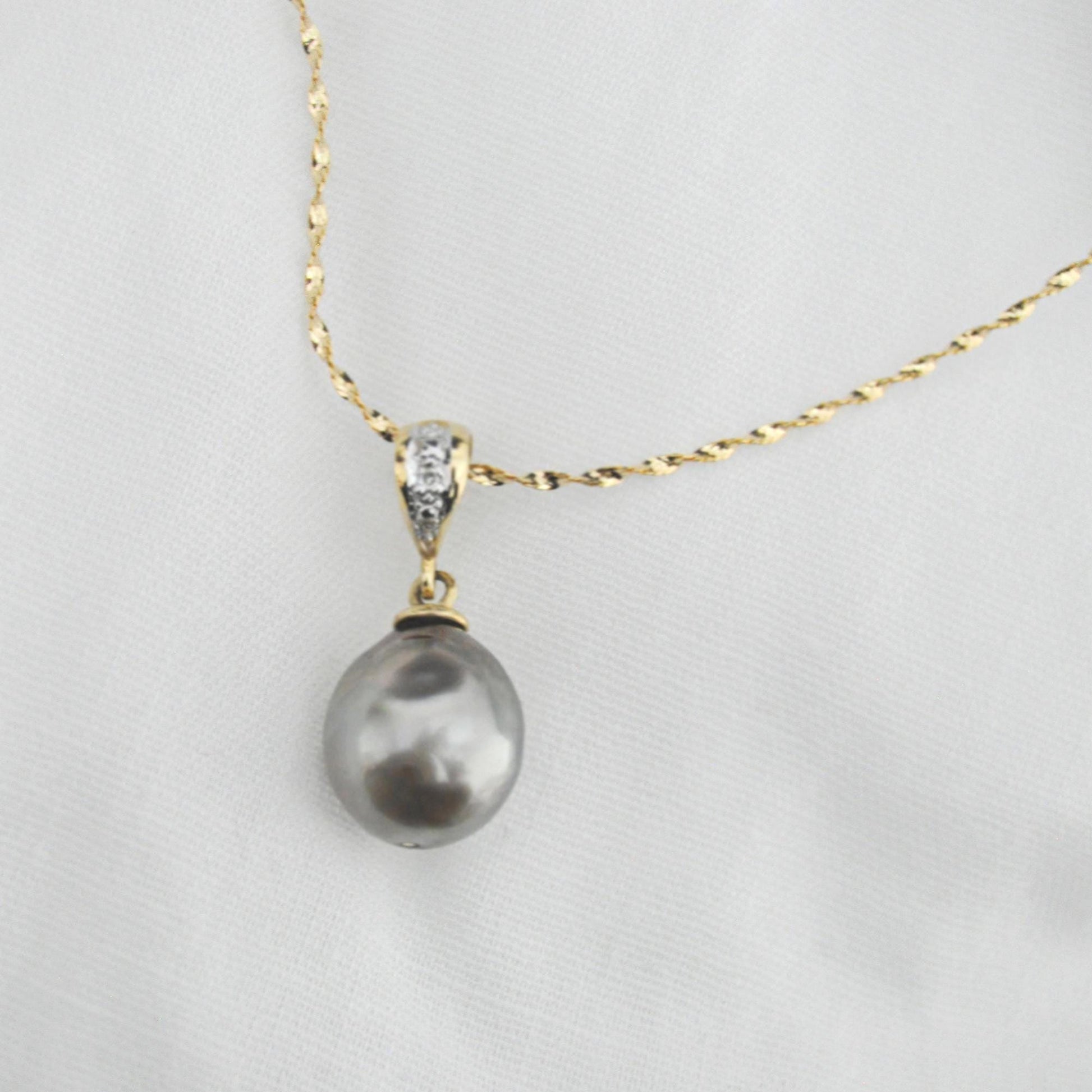 Ally - Tahitian baroque pearl pendant: 12.5mm x 10mm, bronze/dove gray natural untreated color drop pendant set in solid 14kt white and yellow gold with .02ct (1pt.) white diamond accent- no plating. FREE SHIPPING WITHIN THE US.