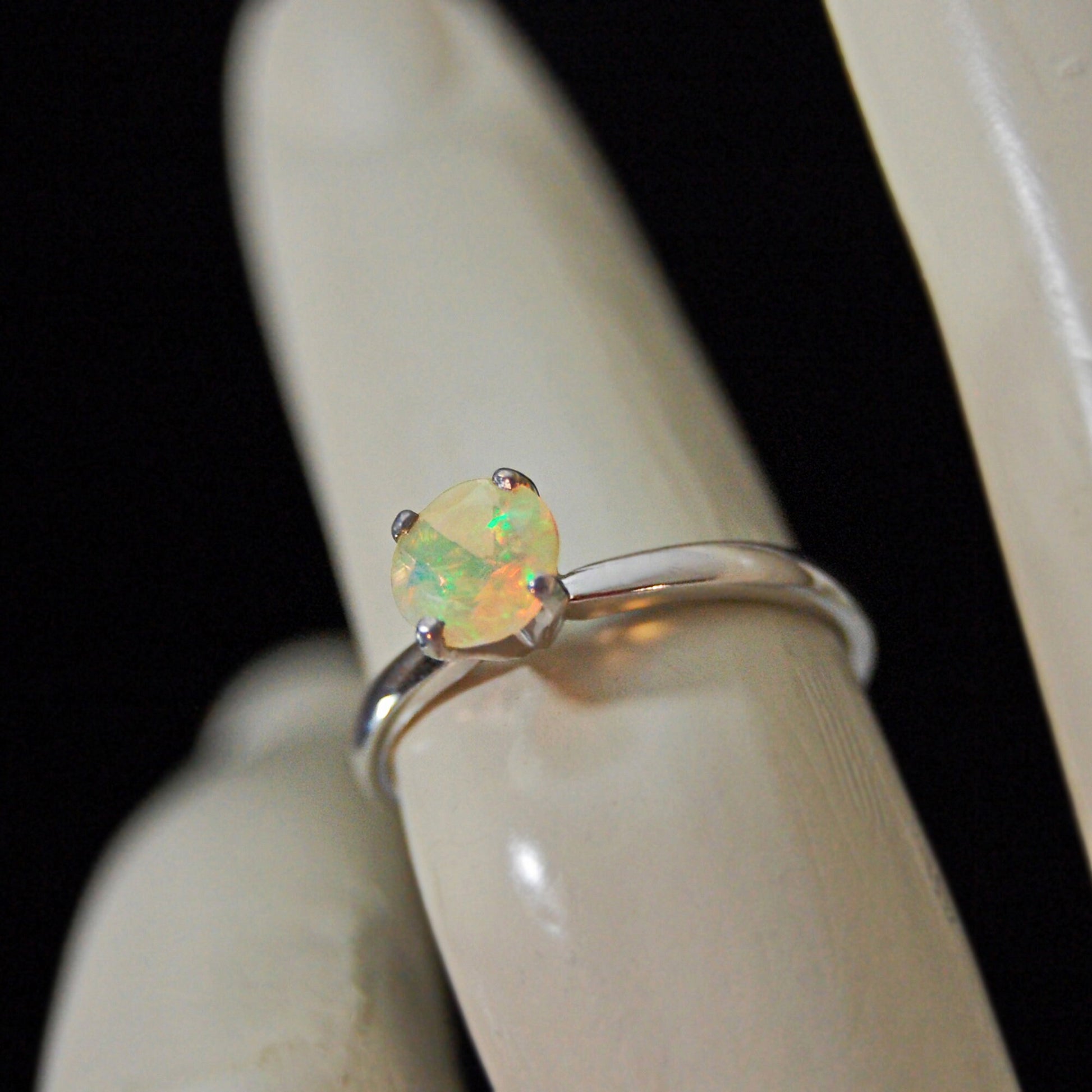 Lively Opal Solitaire Diamond Alternative Ring: Beautiful 6mm Ethiopian brilliant diamond cut round, opal, set in Rhodium plated solid traditional sterling silver for ease of care. Flawless. Finger size 6 3/4.