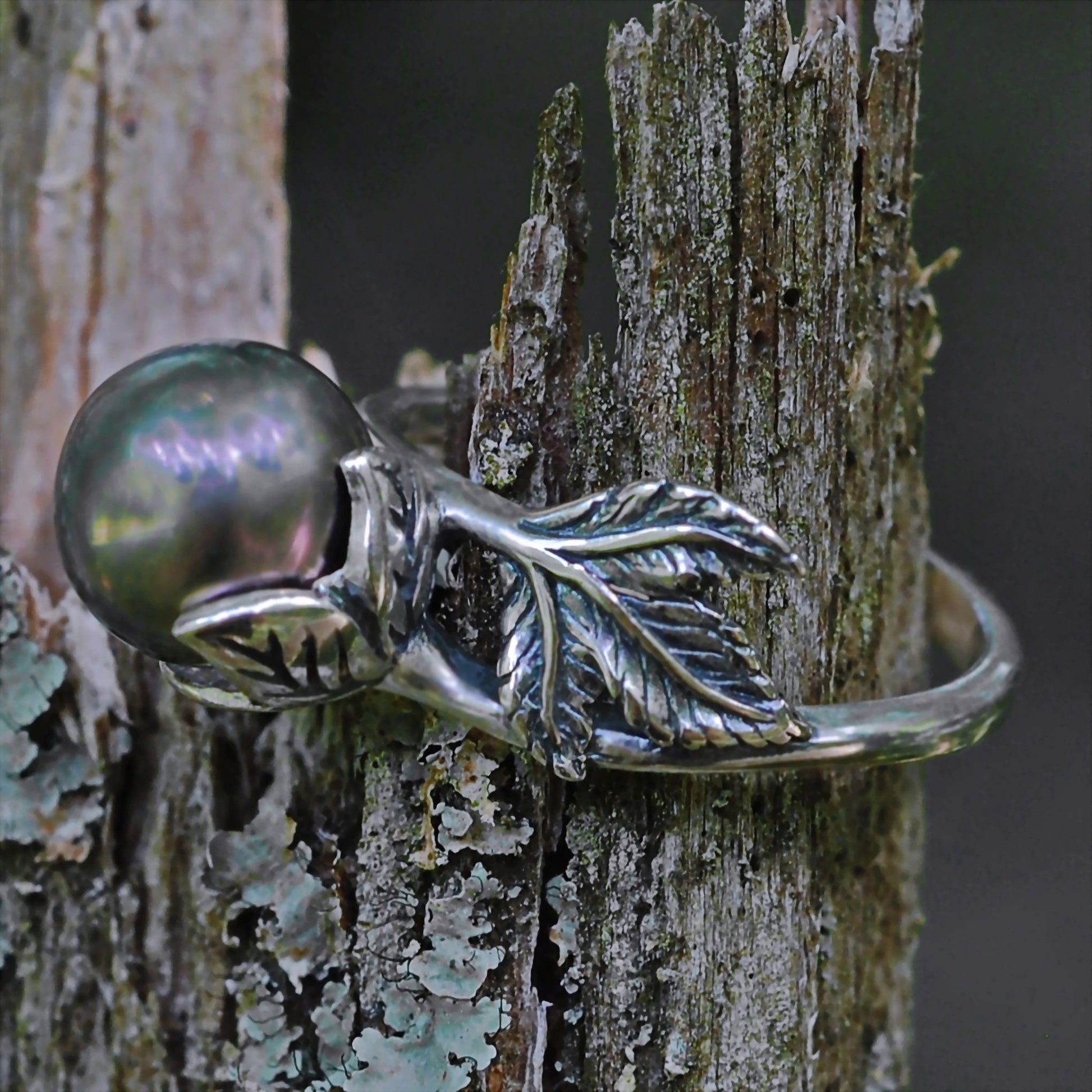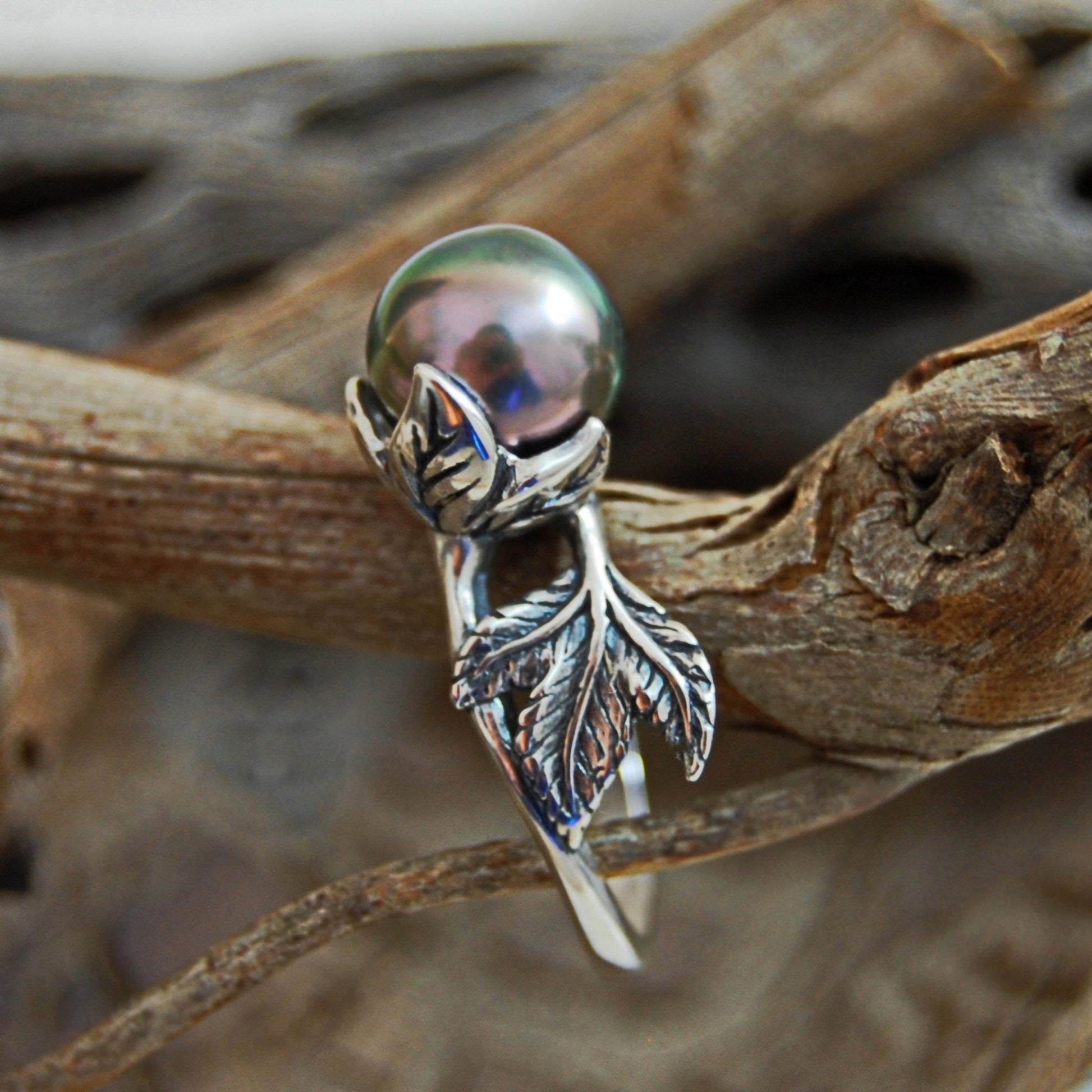 Camellia - Distinctive Tahitian Pearl Solitaire Ring: Beautiful large 9mm Tahitian gray aubergine peacock pearl ring set in a solid Sterling Silver rose style setting patinated to show detail - no plating. FREE SHIPPING WITHIN THE US.