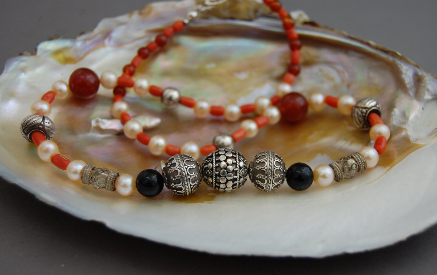 Camilla - Statement Necklace features Pearls and Upcycled Vintage Coral Beads: OOAK (one of a kind) Vintage Bali Silver beads, solid Sterling Silver beads (not plated) some of which were hand made in Bali, genuine Black Onyx gemstone beads, genuine Carnelian gemstone beads, genuine Vintage orange Coral beads, genuine freshwater potato natural untreated color pearls and finished with a solid Sterling Silver -not plated - fishhook clasp for safety. 17 1/2" in length.