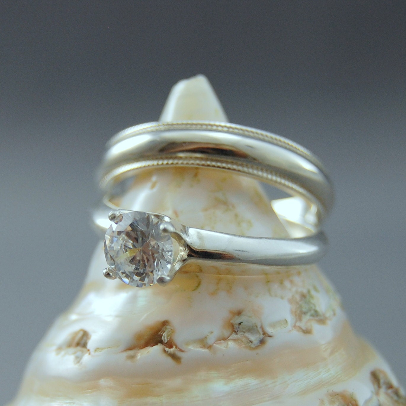 Clara - Brilliant 6mm hand set diamond alternative gemstone 100% conflict free made to order, custom made engagement and wedding set. A plain wedding band - is included with this listing. The sculpted bands would have to be ordered separately. The groom's band would also have to be ordered separately.