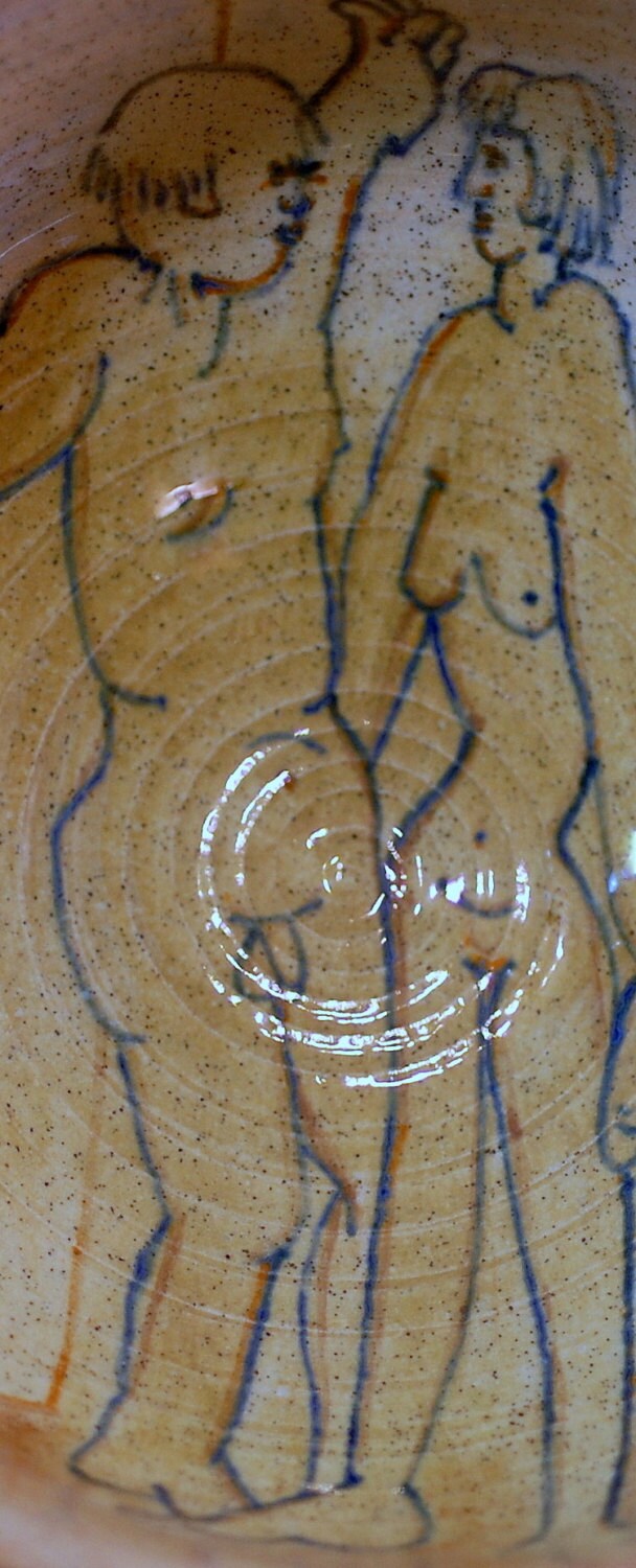 Interior is hand drawn with nude male and female figures on hand painted ground. Exterior sponged and drawn with colored stains over clear glaze.