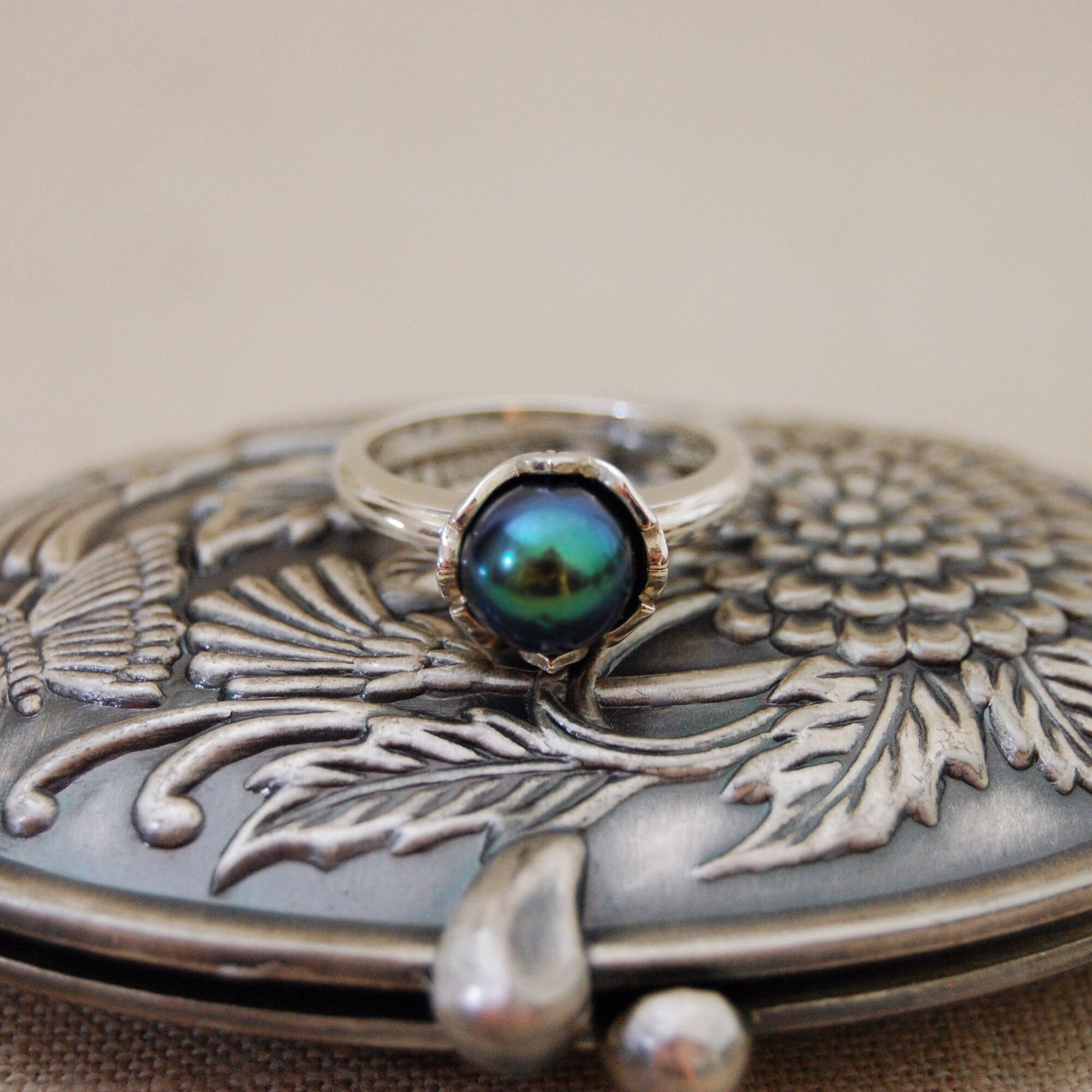 Surprise someone you love with this exquisite, one of a kind, rare, black/green teal peacock solitaire pearl ring. Set in solid, tarnish resistant Continuum® Silver, Evie is easy to care for. Her setting is solid silver -no plating. She would be perfect for any occasion - as a promise ring, engagement ring, wedding ring, statement ring, cocktail ring, or a special anniversary gift. Pearl, a symbol of purity and wisdom, is also the birthstone for the month of April. Enjoy free shipping within the US. Treat yourself or a loved one to this timeless and elegant piece.