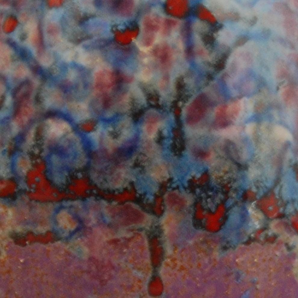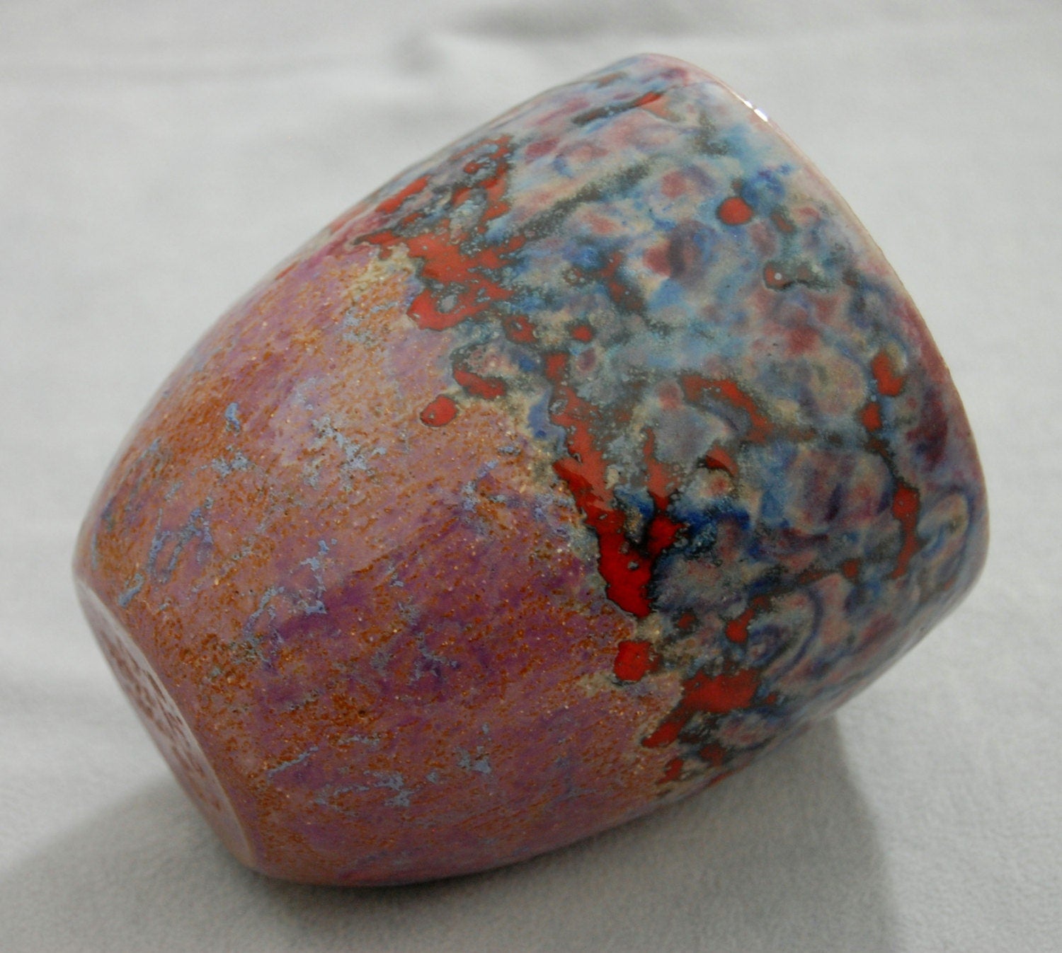 Thrown on my kick wheel (without electricity) and is glazed multiple times in old rose, purples, lavenders, blues, and reds. 5" high x 4" wide x 4" deep.
