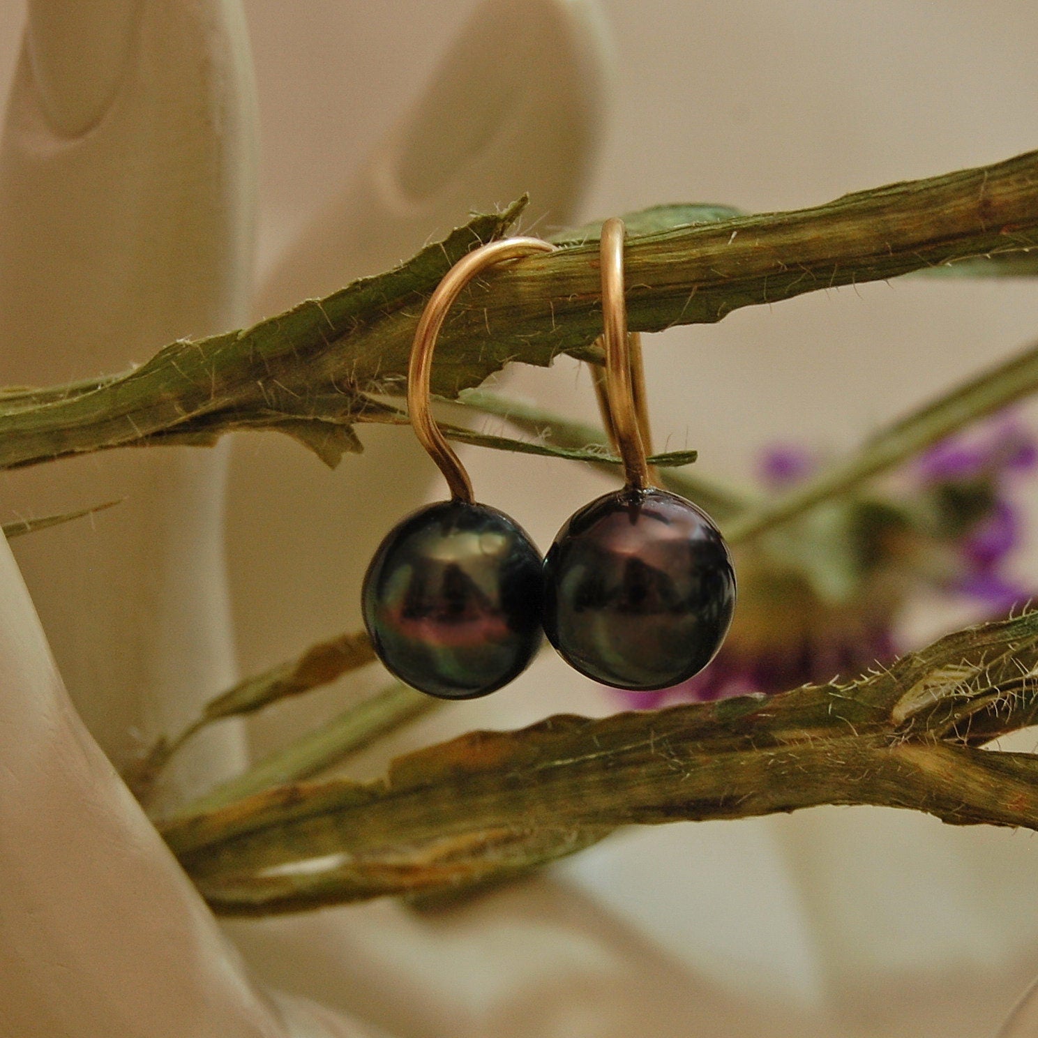 Gemma - Black Peacock Pearl Dangle Earrings: Vibrant, OOAK (one of a kind), beautiful 8mm Tahitian pearl earrings set in solid 14kt yellow gold earwires - not plated. Pearl is the birthstone for April.