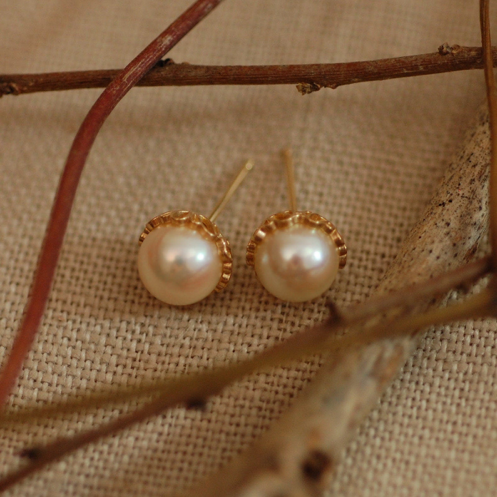 Unique Pearl Stud Earrings: OOAK 7mm freshwater cream color pearl stud earrings set in a solid 14kt yellow gold filigree setting - no plating. Beautiful color. Flawless!