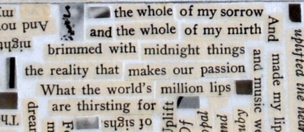 The rescued and re-purposed wooden frame was made a part of the painting by using words taken from an old book and is finished and sealed with acrylic paint. The words make up small poems that surround the painting. You could add an additional frame if you wish, but you could hang it as it is. The center of the image is glazed with glass.