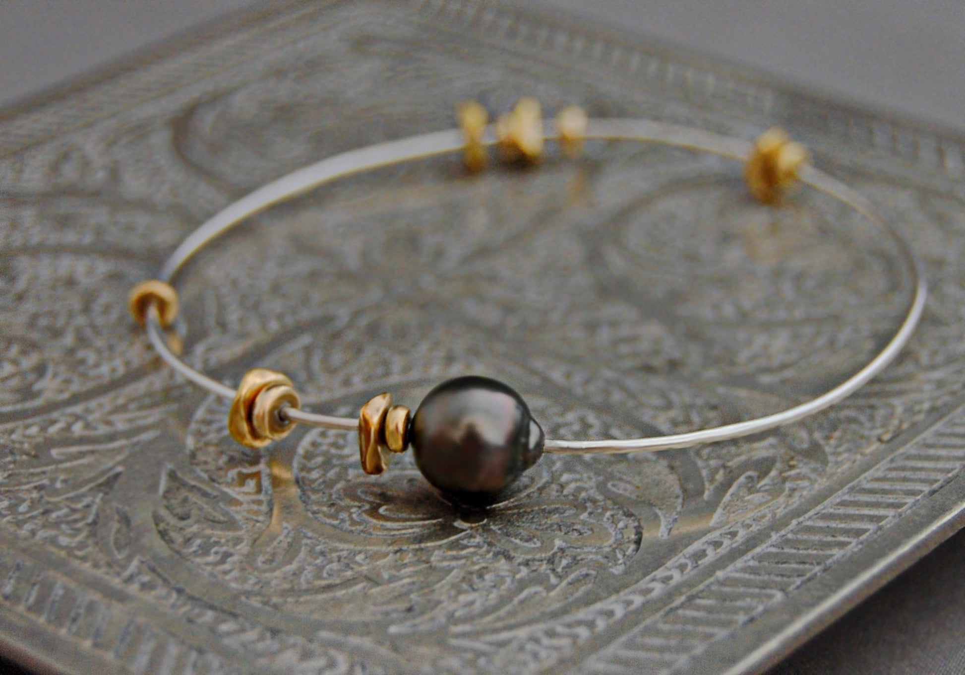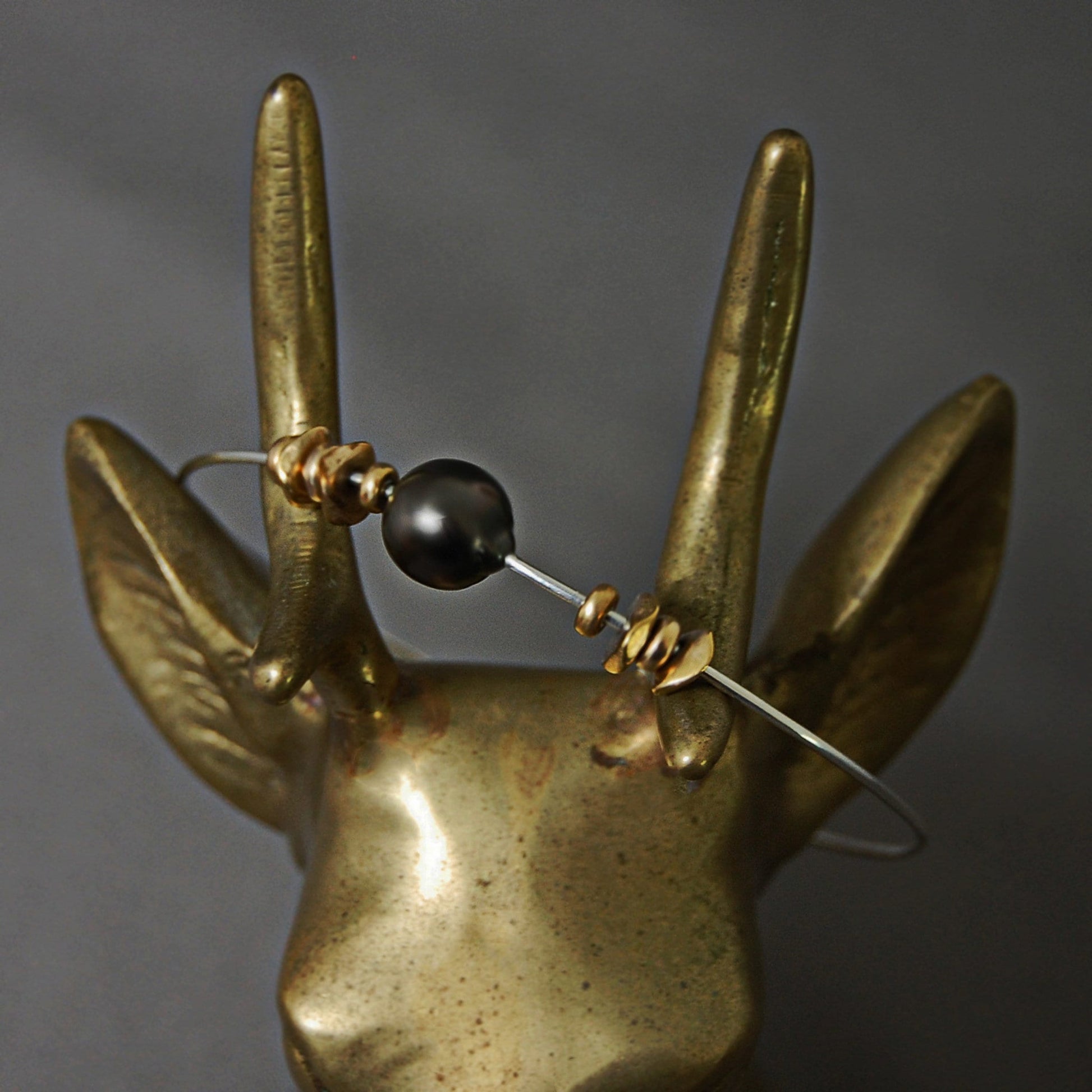 Lilith - Sterling Silver & Tahitian Pearl Bangle Bracelet with African Brass Beads. Free Shipping US.