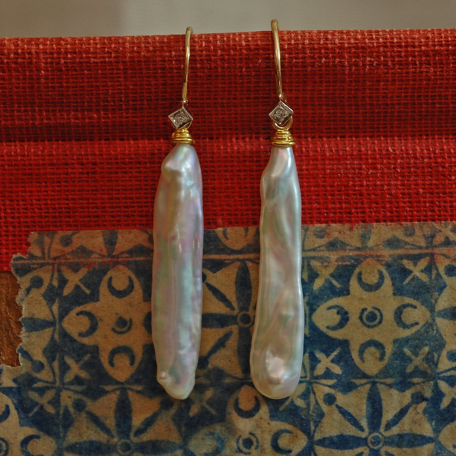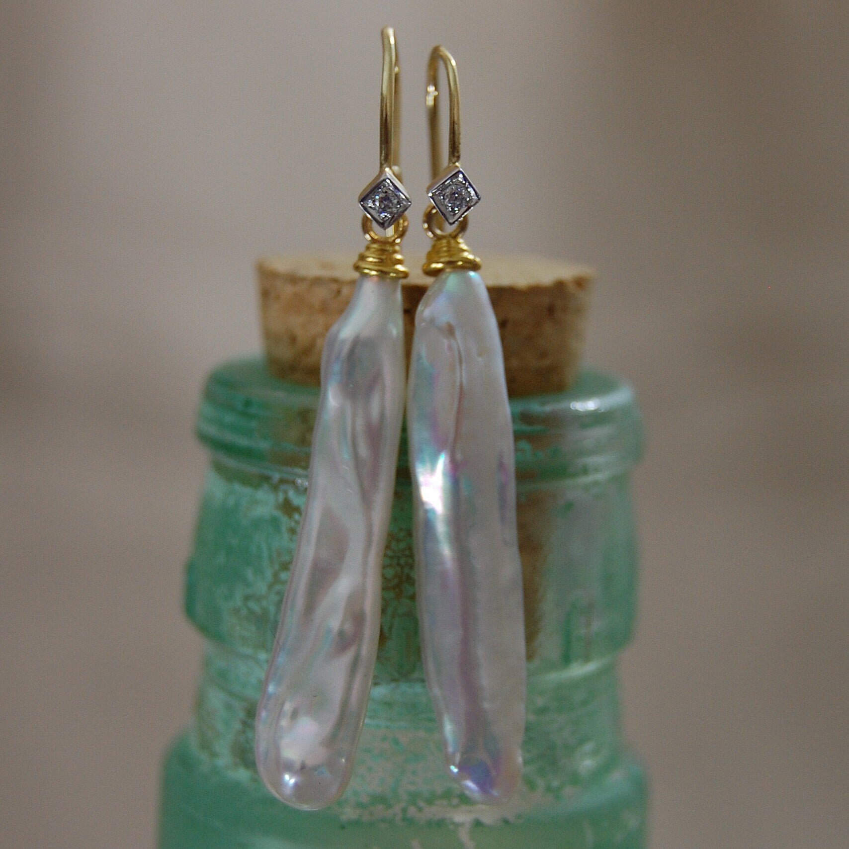 Lusca - Pearl Dangle Earrings: Stick pearl dangle drop earrings set in solid 14kt gold featuring a beautiful .01kt diamond accent. Bridal fashion, gold earrings, stick pearls, diamond accent, gift idea, for her. FREE SHIPPING WITHIN THE US.