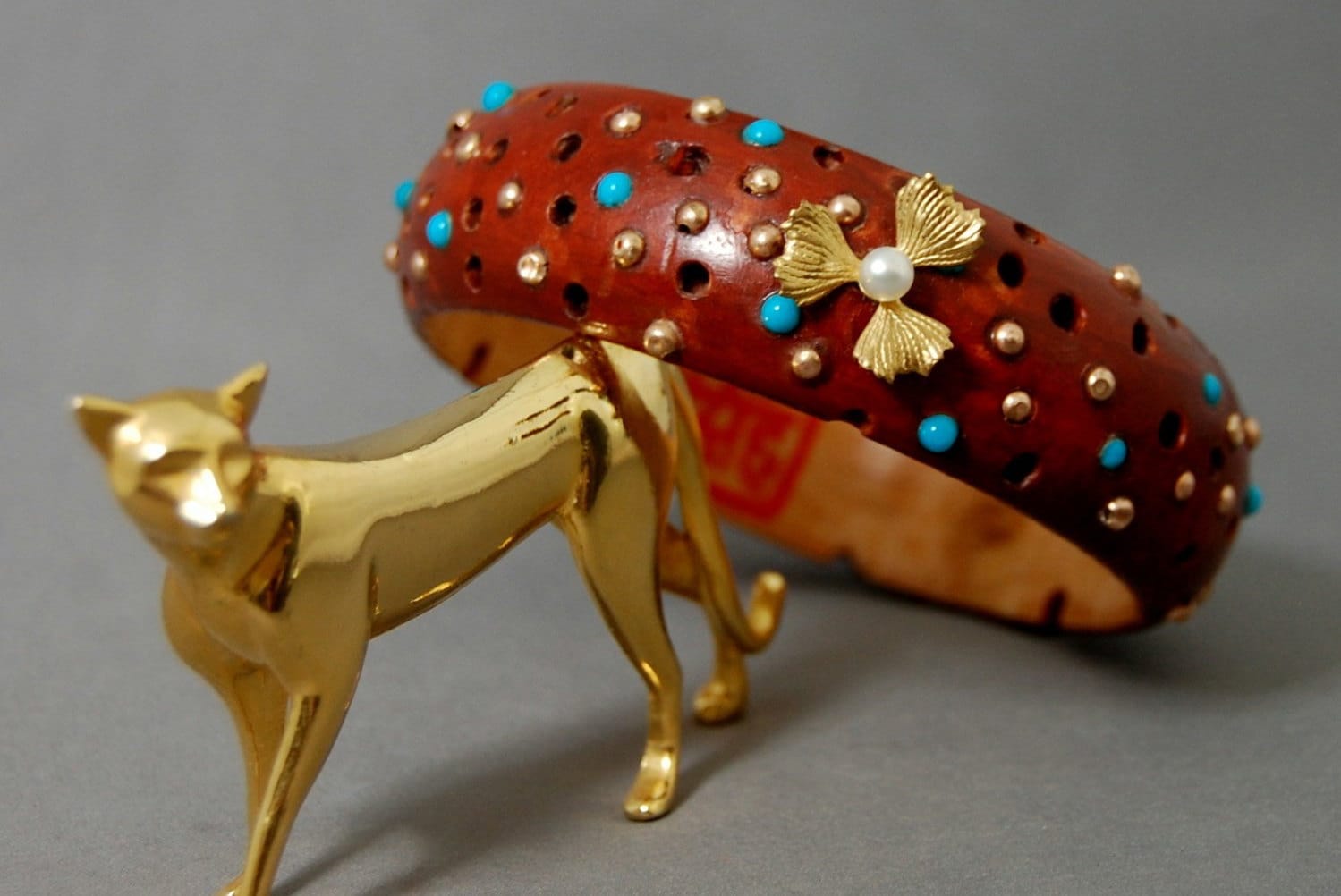 Magnolia - Eco fashion bangle: OOAK (one of a kind) unique distressed wood Eco fashion boho bangle bracelet using turquoise gemstone and 14kt rose gold/sterling silver beads, a brass flower, and a 4mm freshwater pearl center. FREE SHIPPING WITHIN THE US.