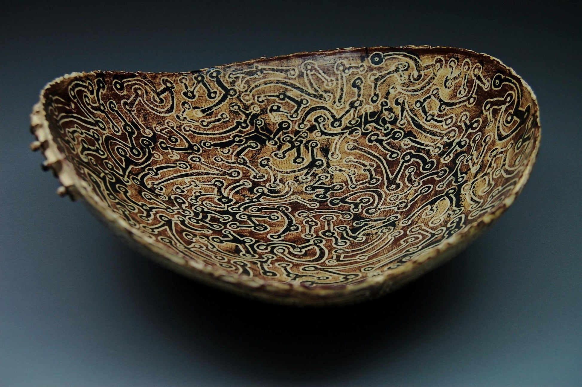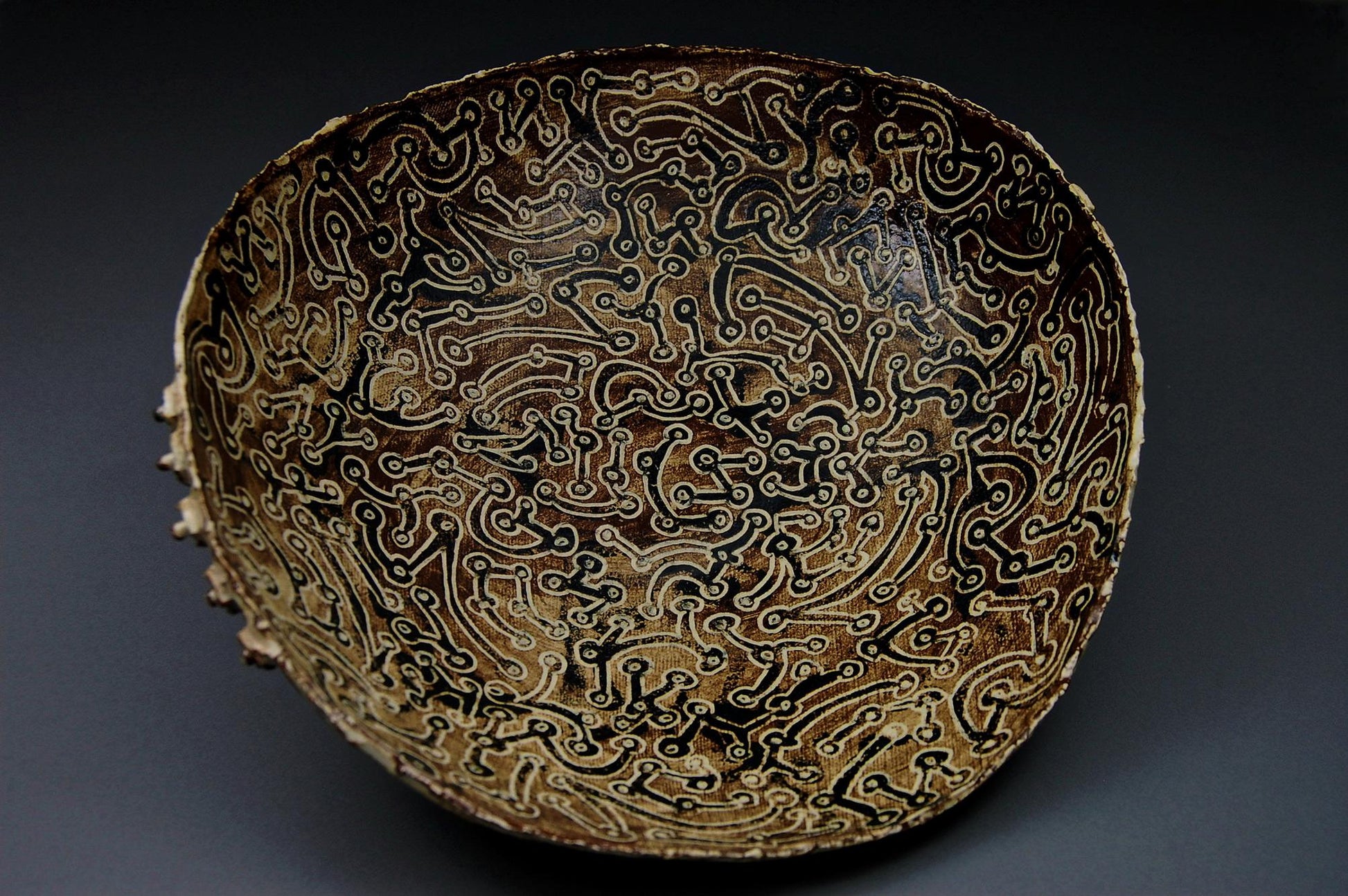 Malmsey Mambo - Hand built dancing ceramic bowl, medium in size, with sgraffito drawings and slab runners. Boss additions to the pinched rim add interest. One of a kind. FREE SHIPPING WITHIN UNITED STATES.