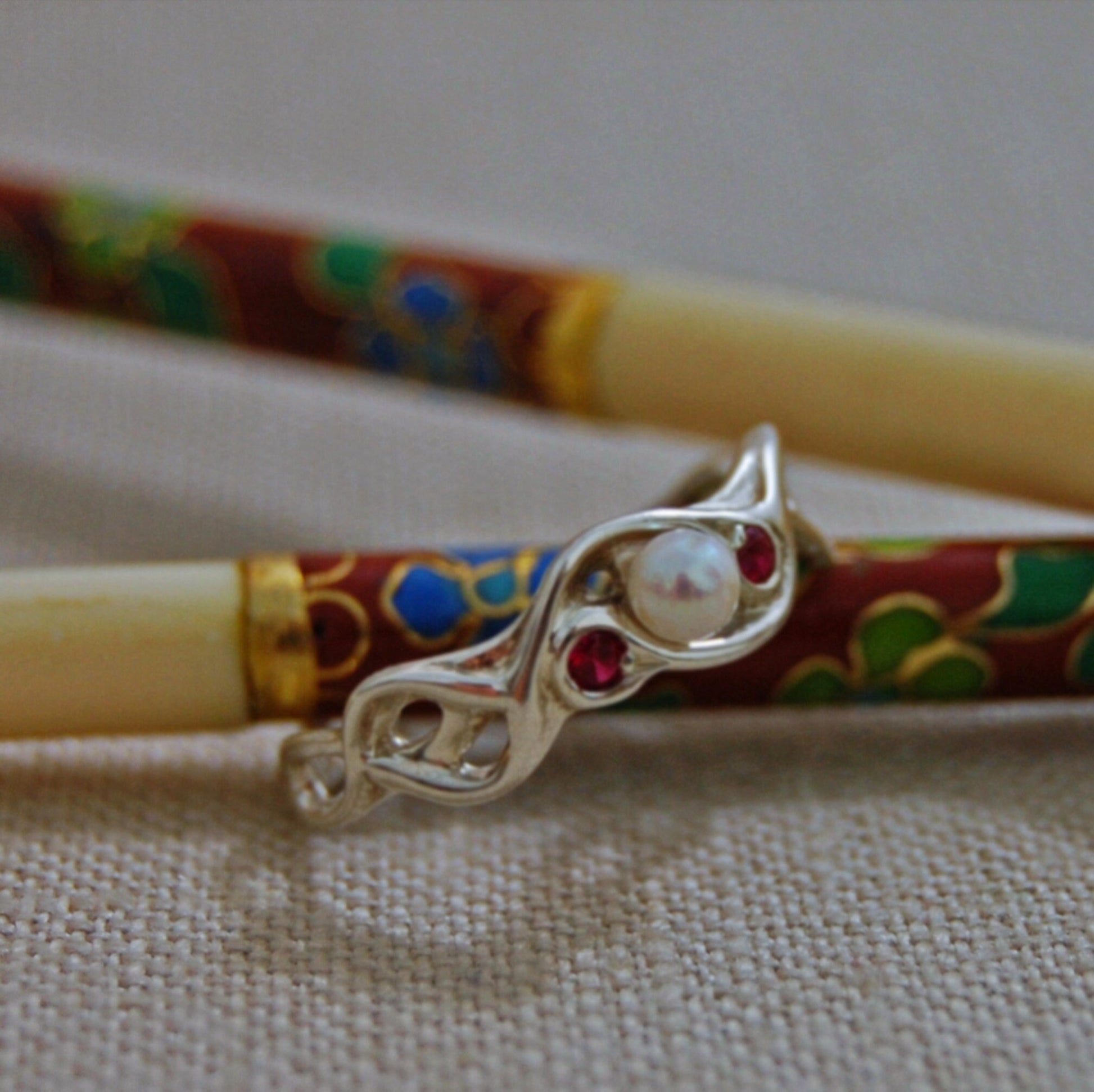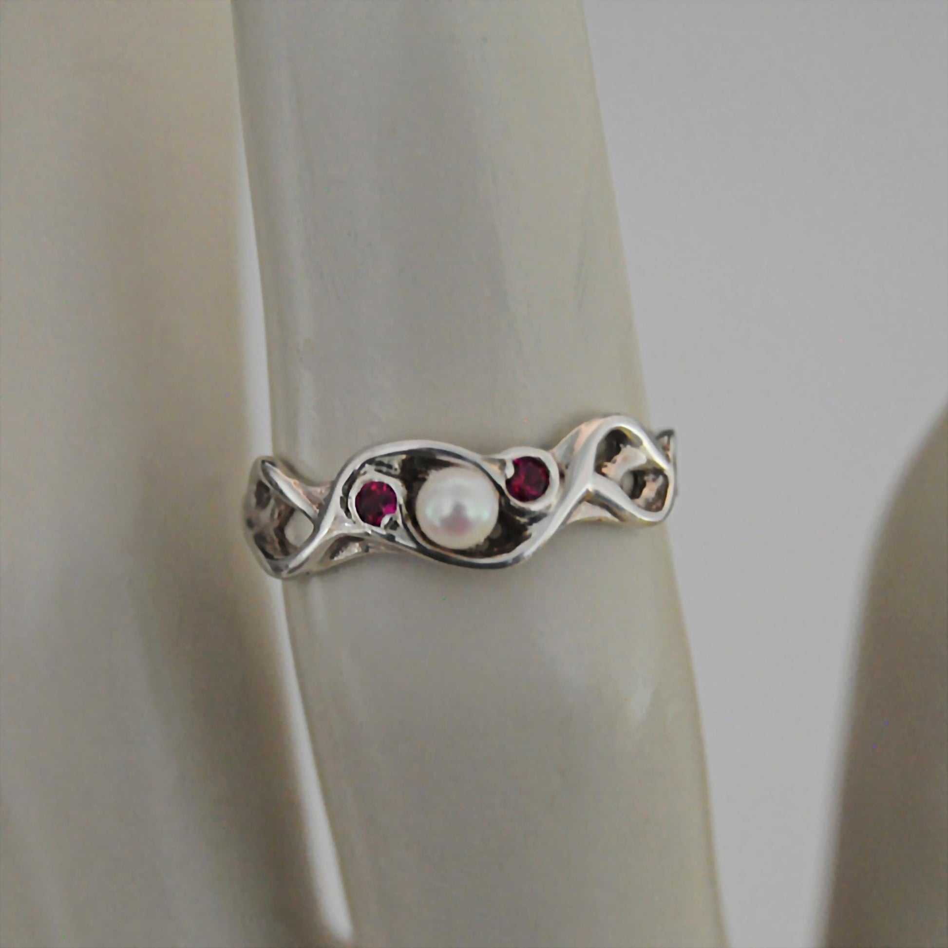 Mira - Pearl and ruby ring set in easy care Continuum® Silver is available for immediate shipment. Shop exclusive wave ring design. Mira features an Akoya pearl with genuine earth mined ruby accents. Finger size 7. Sizing, if needed, is free. Shipping is free within the US.