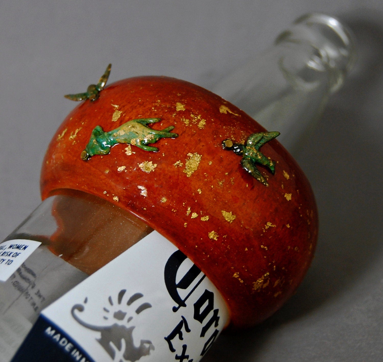 Nadia is made of solid sustainable wood which features 3 brass birds and a lady's hand. Throughout the bangle there are 14kt gold flakes that have been sealed onto the wood. The wood is finished using multiple coats of shellac - many coats! These take an amazing amount of time and effort to make!