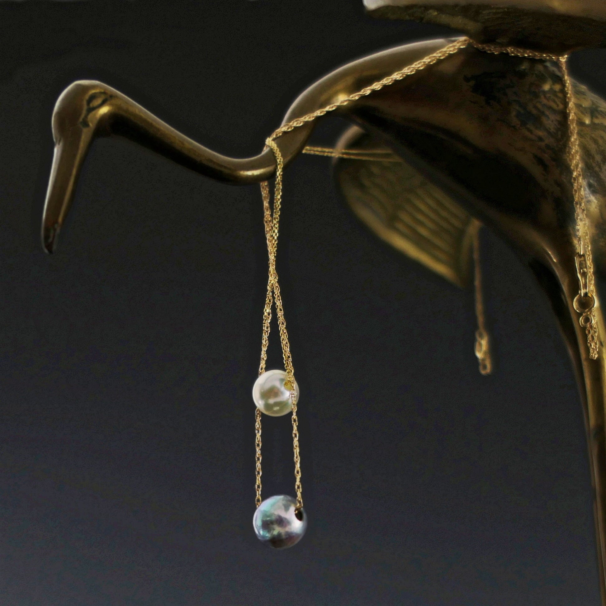 Noelani - Floating Akoya Pearl Pendant Necklace in White or Blue/Gray Set on Solid 14kt Gold Chain. Free Shipping US.