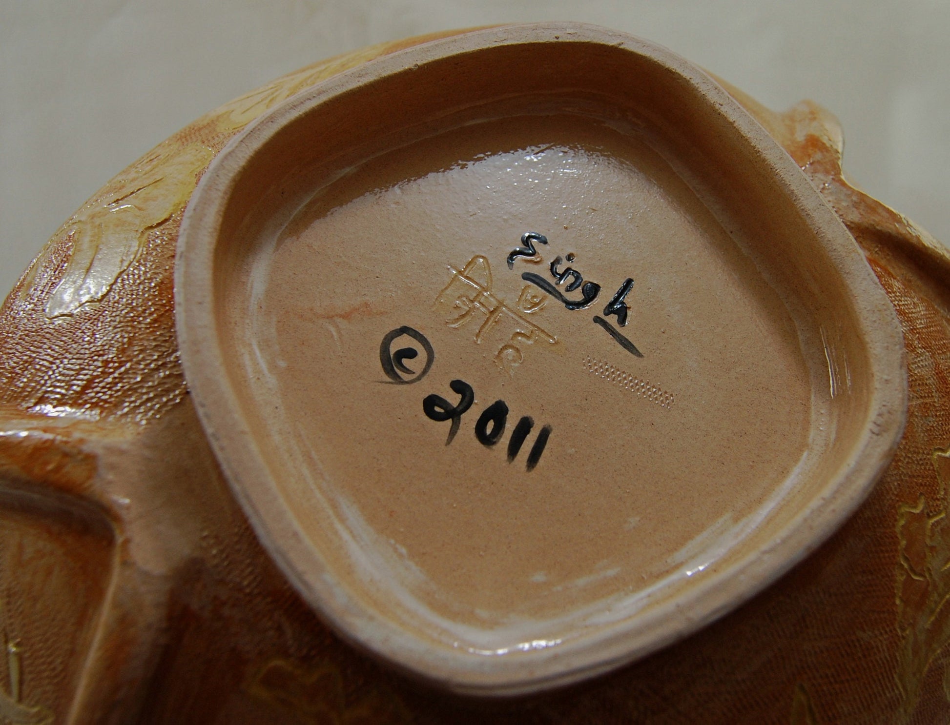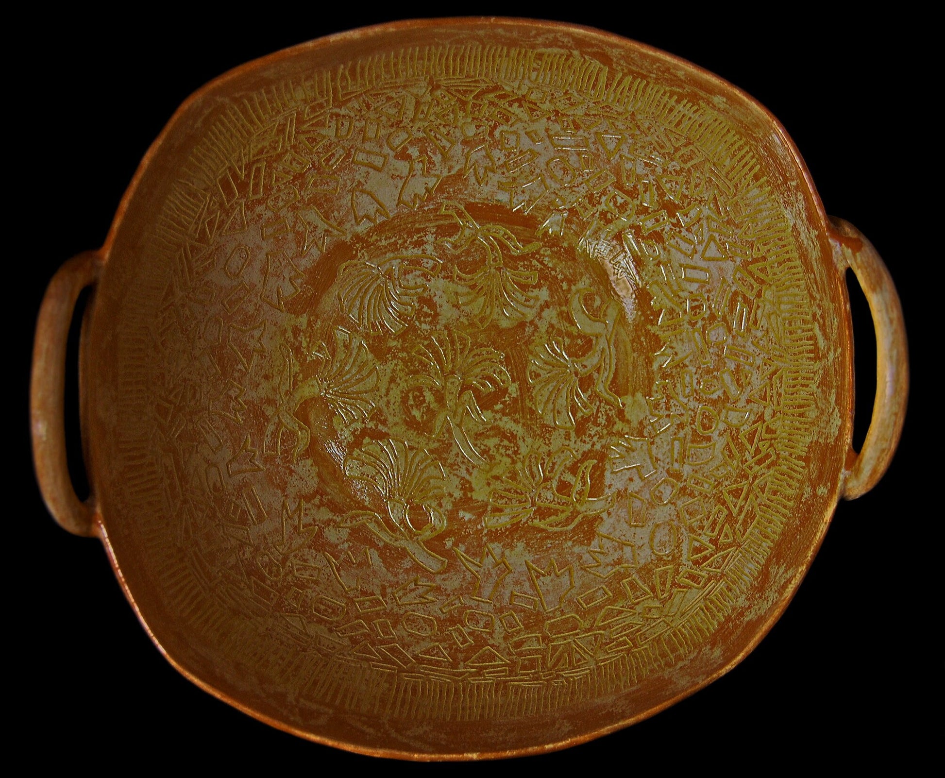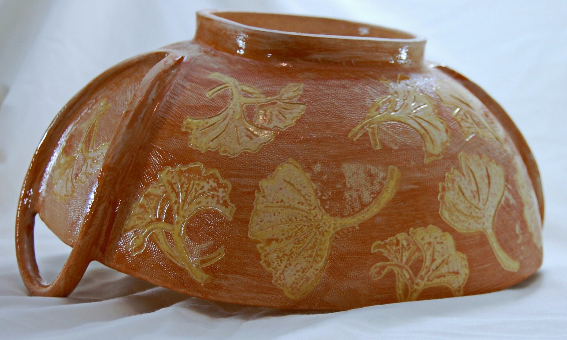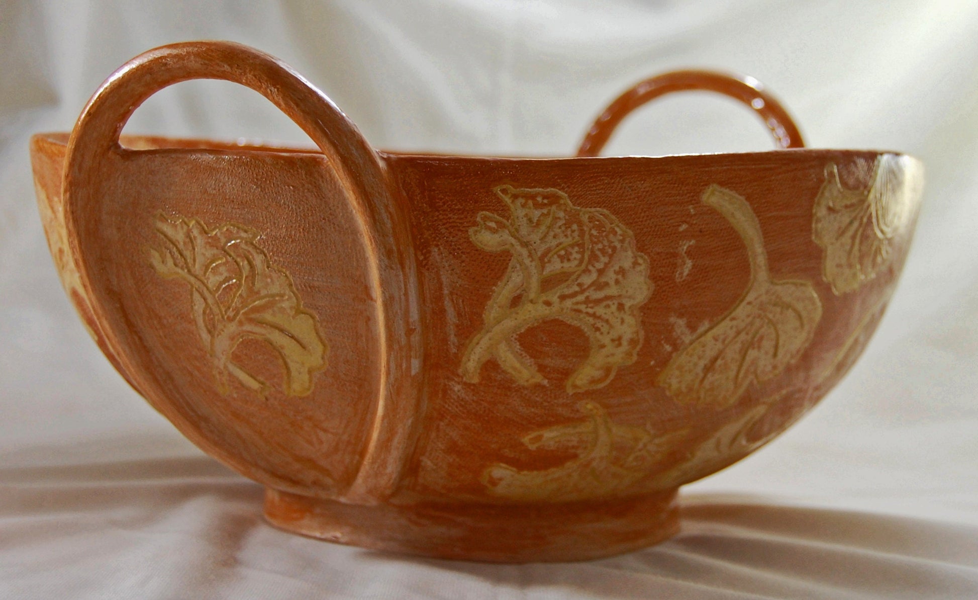 Provencal Ginkgo - Large handmade bowl with sgraffito drawings and added strap handles with a Ginkgo leaf motif. Free shipping US.
