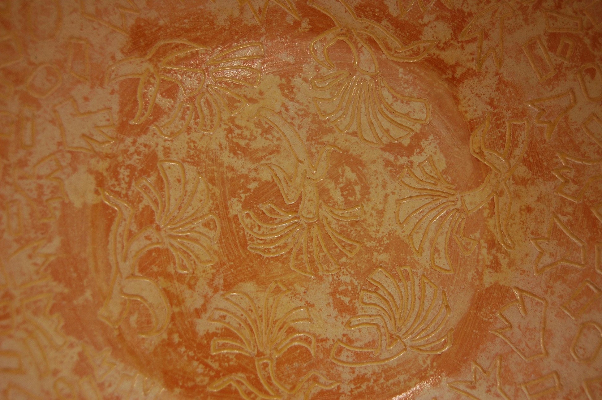 Provencal Ginkgo is large handmade ceramic pottery bowl featureing intricate sgraffito drawings and unique strap handles. She is meticulously slip painted and oxide stained in rich rust oranges and soft celadon yellows, creating a warm and inviting aesthetic. Perfect for fruit, various breads, or simply displayed as a beautiful centerpiece, this bowl will bring the beauty of nature into your home. Shipped free within the US.