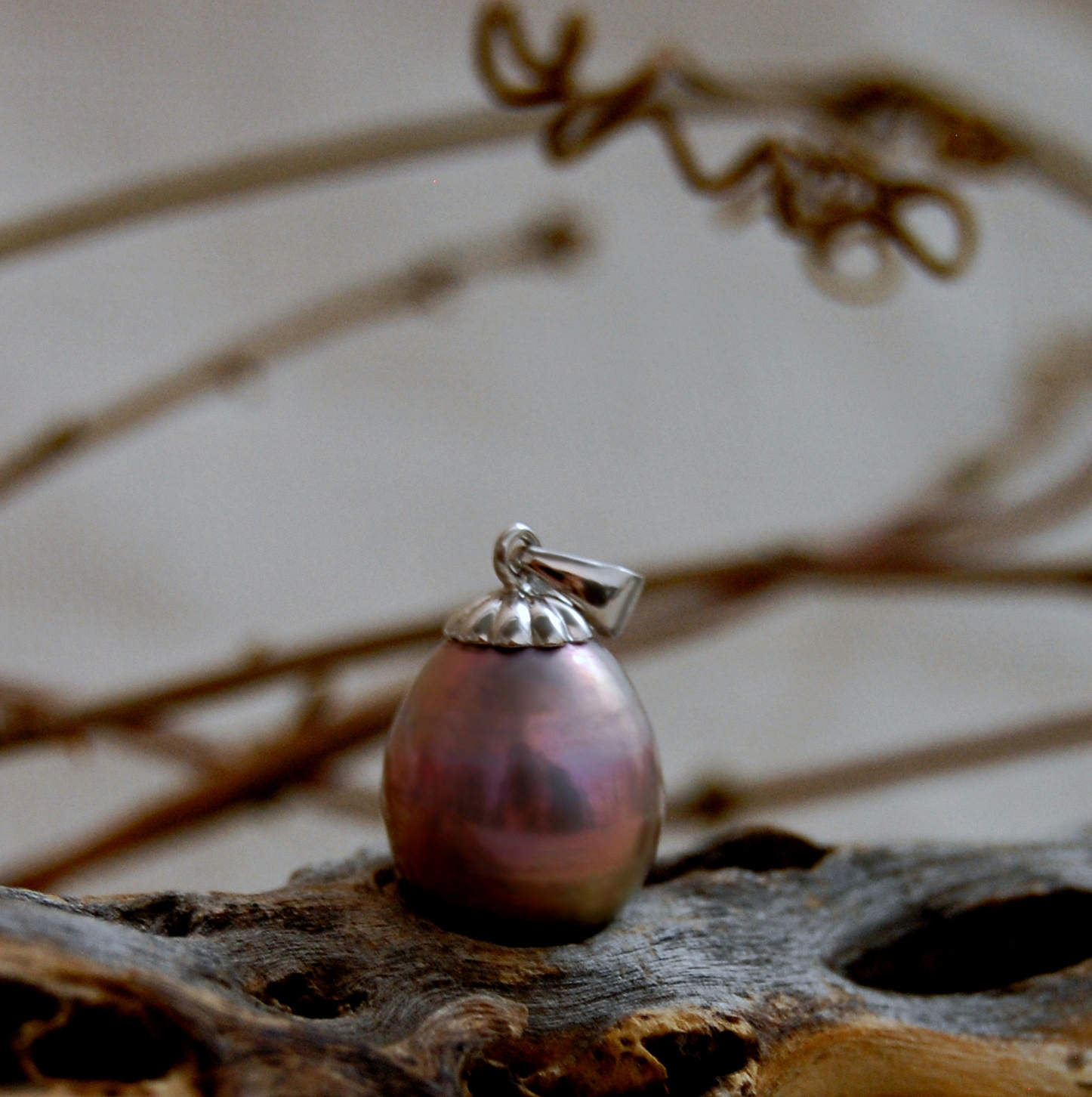 Romy - Rare and beautiful NATURAL untreated metallic purple color freshwater pearl pendant set in a solid 14kt White Gold bail - no plating. FREE SHIPPING WITHIN THE US.