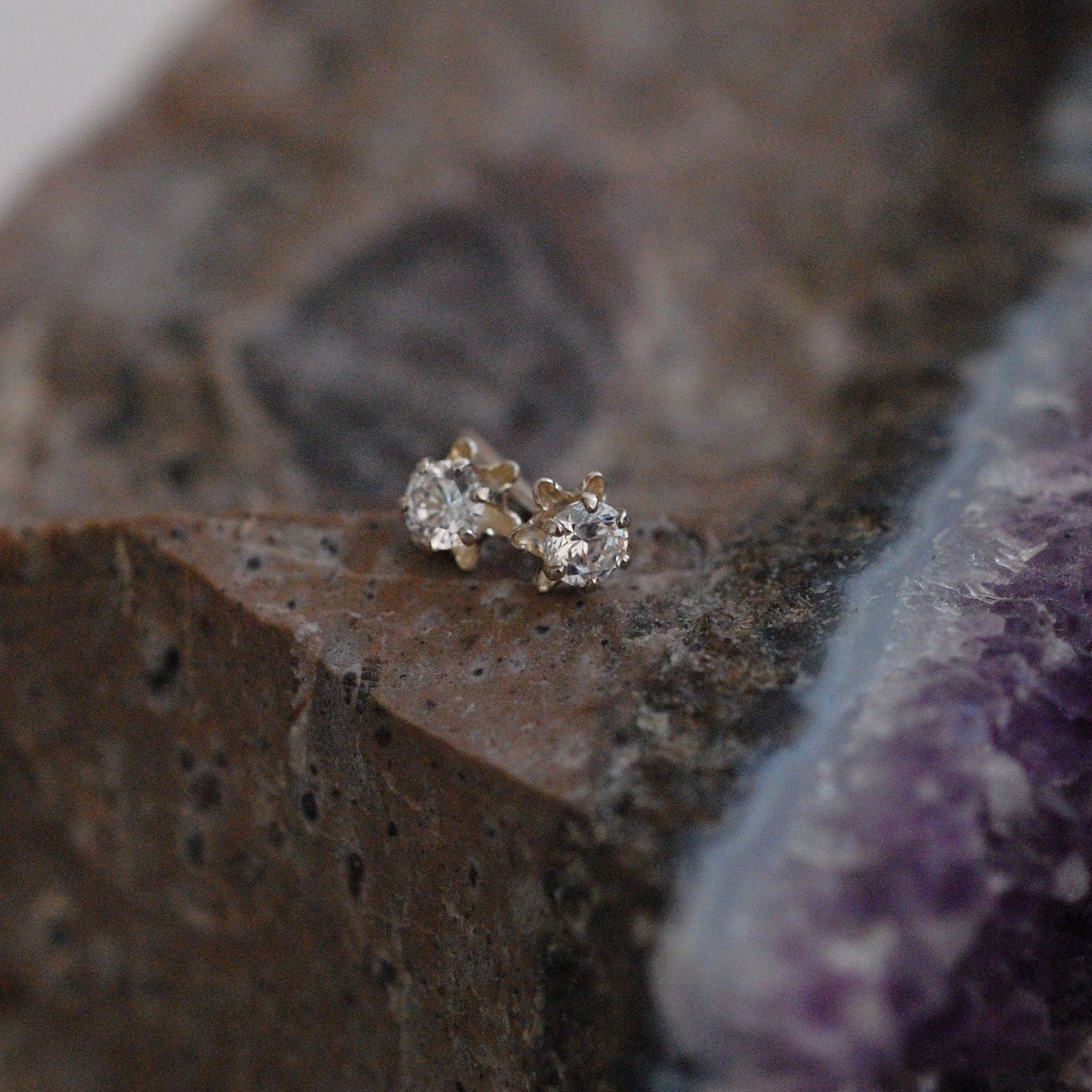 Very small, lightweight gemstone earrings: Sparkling white 3mm, round, faceted, conflict free, Cubic Zirconia gemstone stud earrings, set in solid sterling sliver with rhodium plating for ease of care.