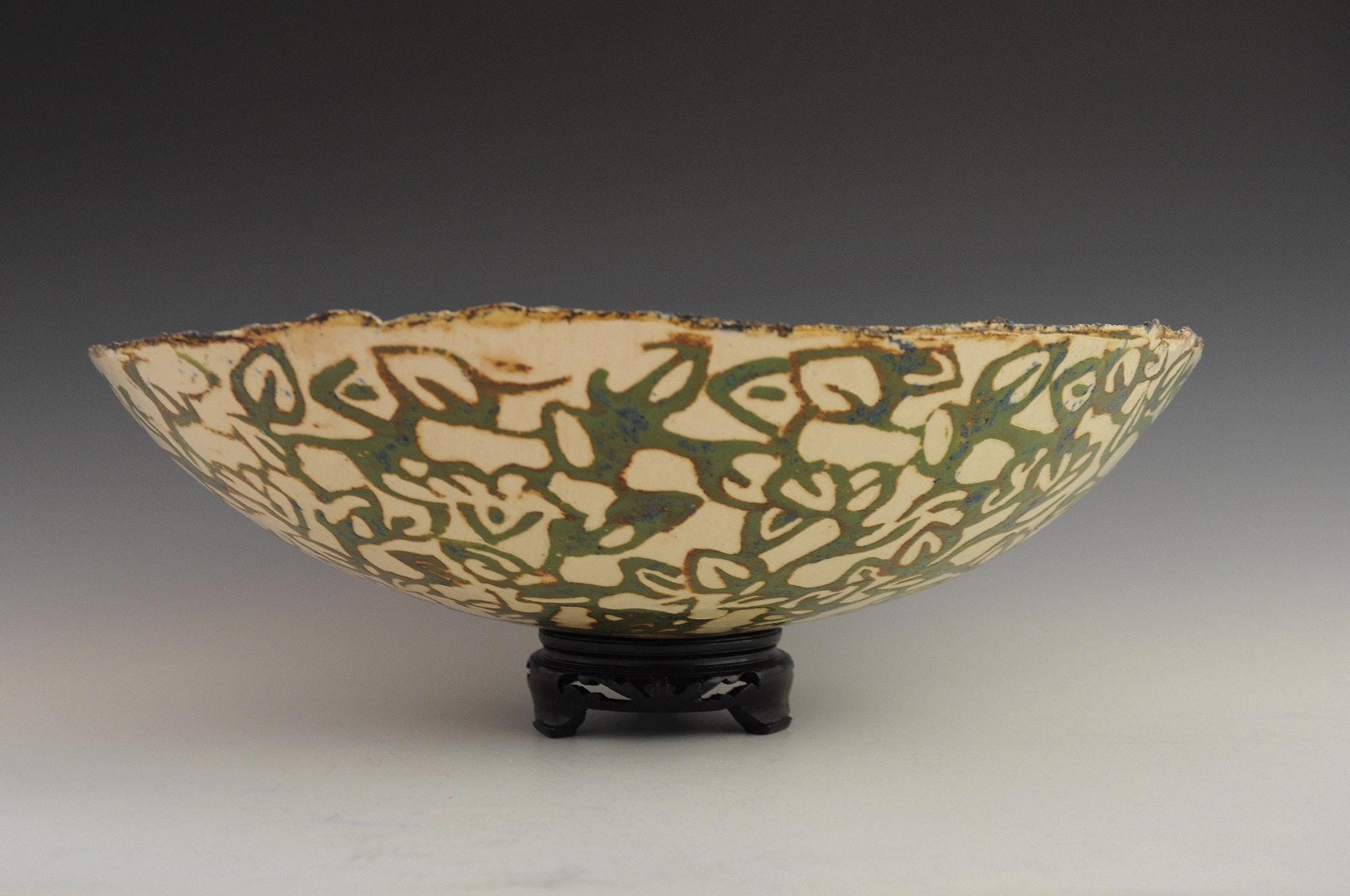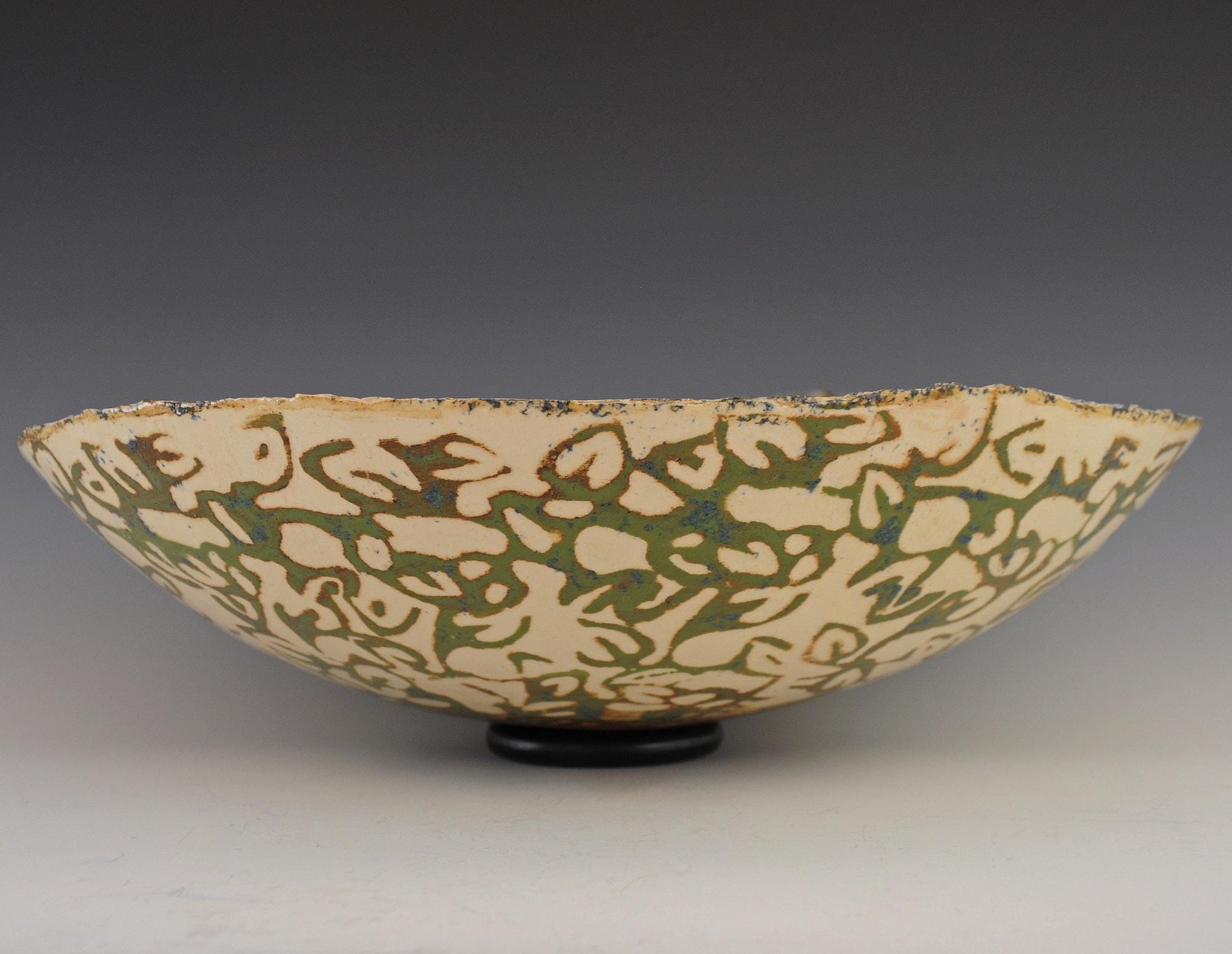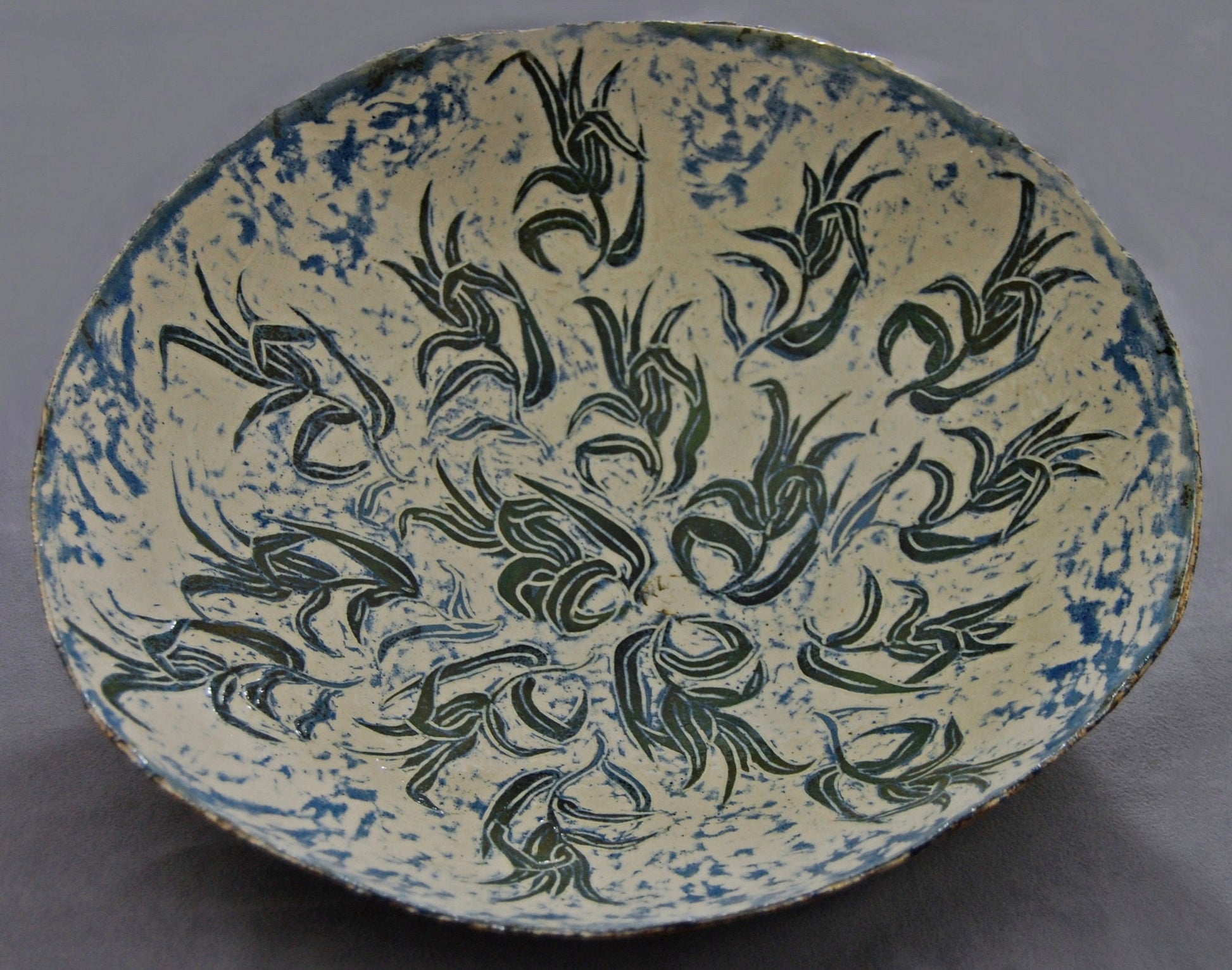Slip painted in greens and blues, then carved through the slips to the off-white ground. Features foliate motifs on both the interior and exterior.
