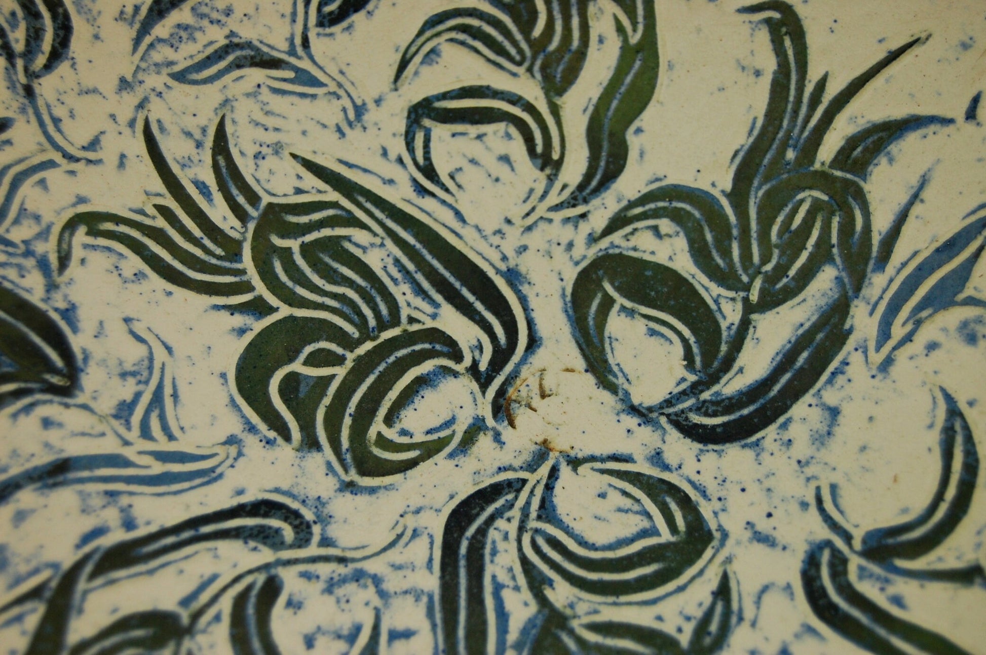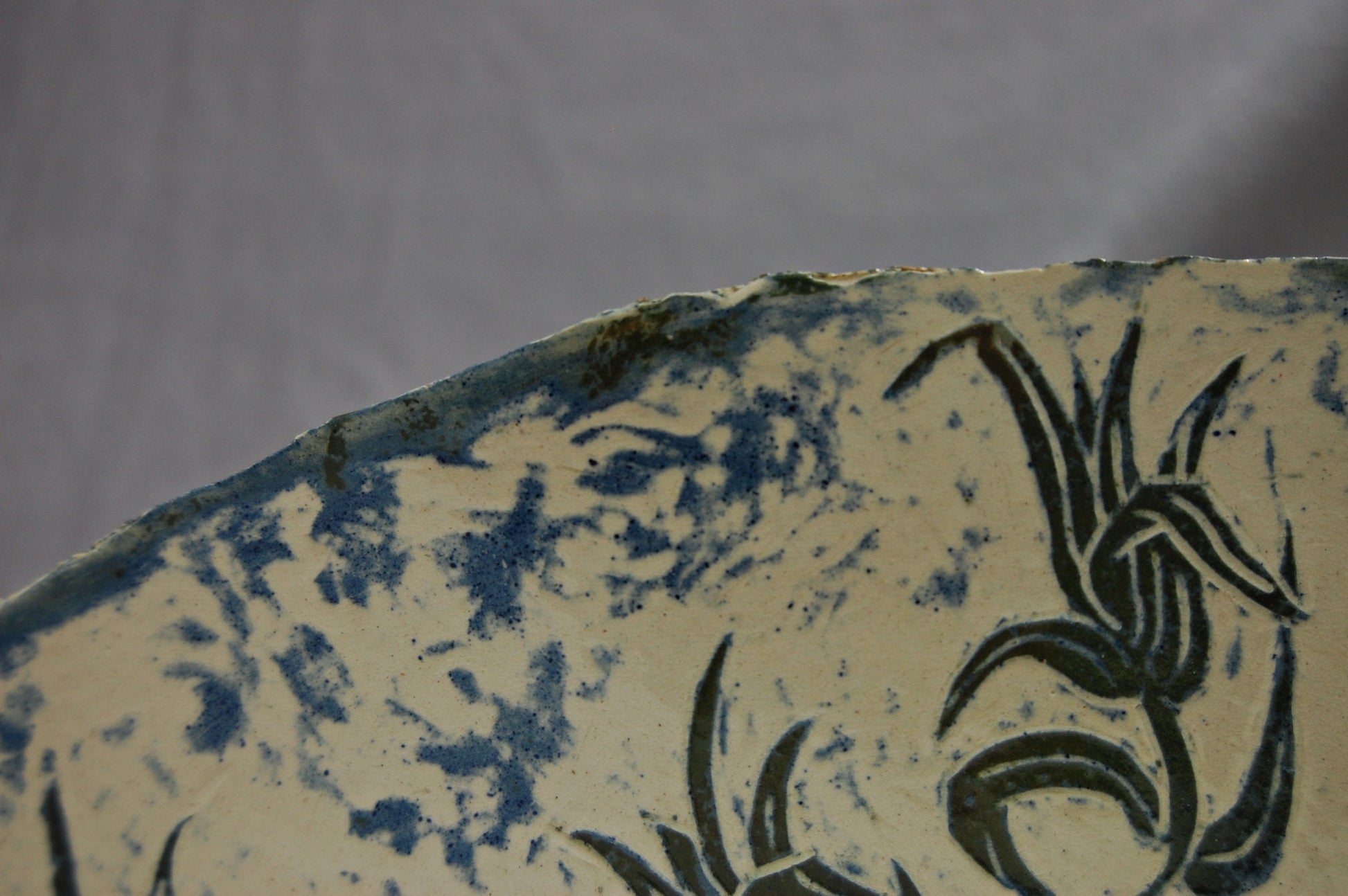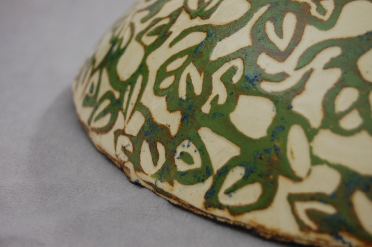 Slip painted in greens and blues, then carved through the slips to the off-white ground. Features foliate motifs on both the interior and exterior.