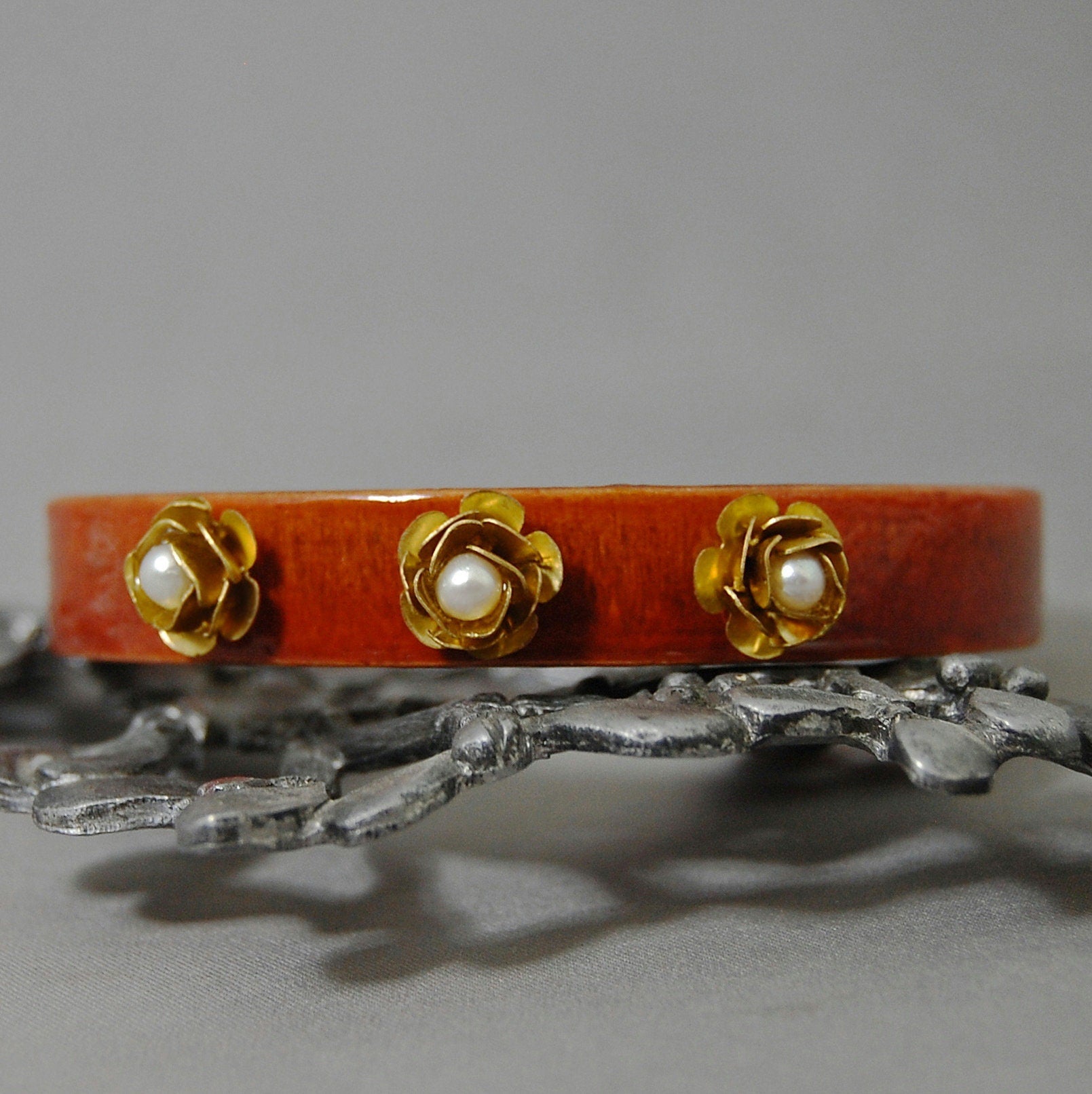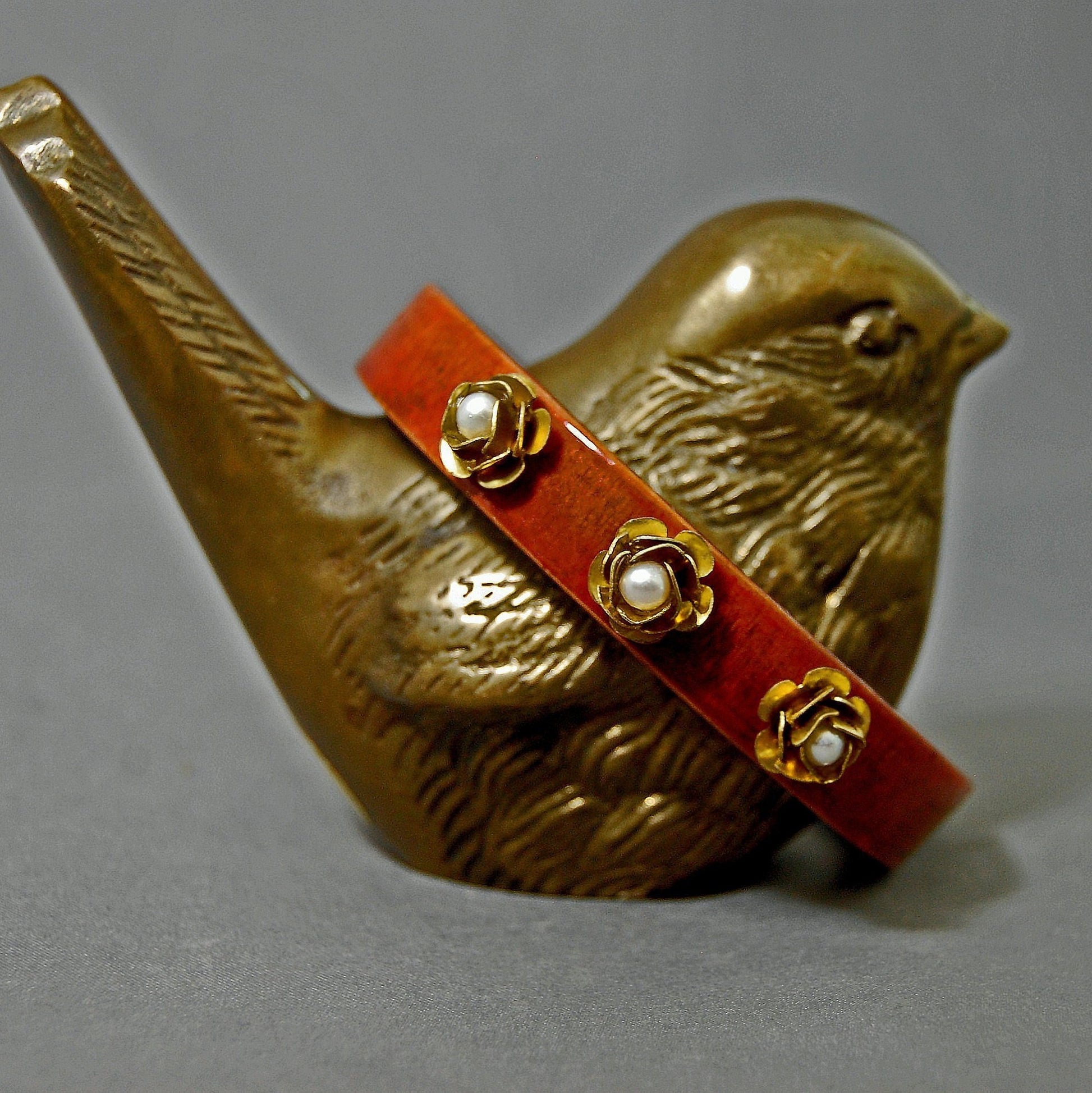 Veera - Unique Eco-Friendly Fashion one of a kind handmade wooden bangle features solid brass roses and small white freshwater pearls. Handmade Bangle, wood bracelet, brass / pearl bangle, eco-friendly fashion, one of a kind gift for her. FREE SHIPPING WITHIN THE US.